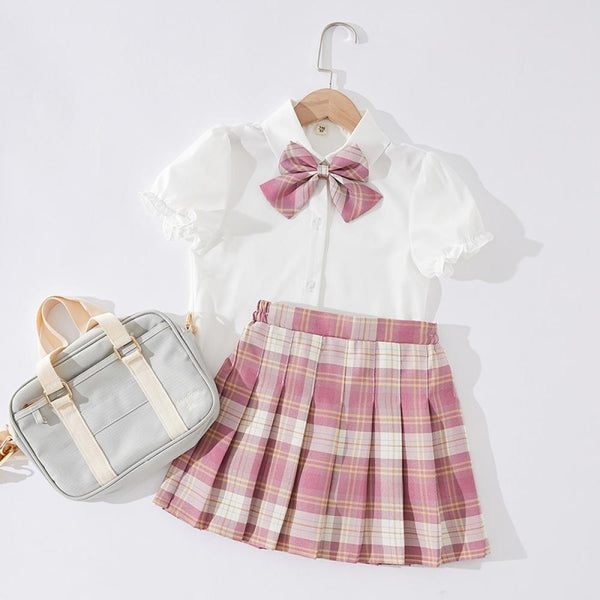 Girls Summer Set JK Uniform School Top and Plaid Pleat Skirt Set Baby Girl Clothes Wholesale
