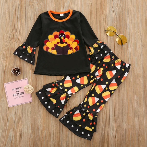 Thanksgiving Girls Long Sleeve Embroidered Cartoon Turkey T-Shirt Printed Flared Pants Set Wholesale