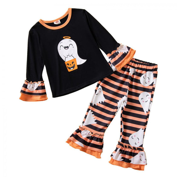 Halloween Spring Autumn Girls Pumpkin Long Sleeve Top Flared Pants Two Piece Set Wholesale Girls Clothes