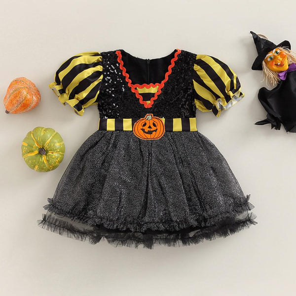 Halloween Toddler Girls Sequins Pumpkin Print Dress Cute Baby Western Style Mesh Princess Dress Wholesale