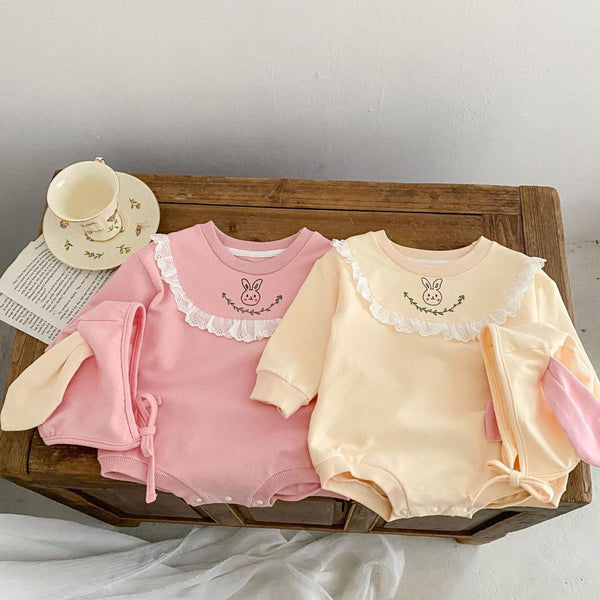 Autumn Baby Girl Round Neck Long-sleeved Rabbit Print Romper + Hat Wholesale Girls Clothes
