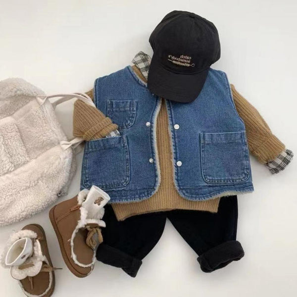 Baby Winter Plus Velvet Denim Waistcoat Boys And Girls Solid Color Padded Vest Wholesale Baby Clothes
