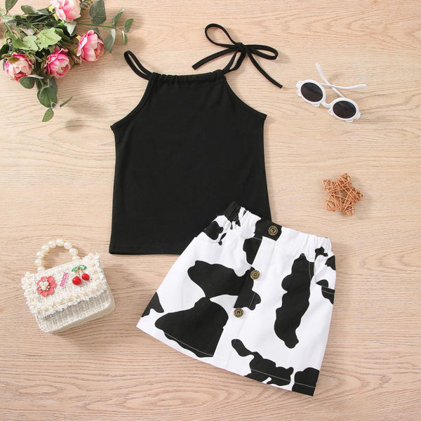 2-Piece Set 2022 New Girls' Leaky Shoulder Cotton Black Knitted Top Cow Print Skirt Wholesale