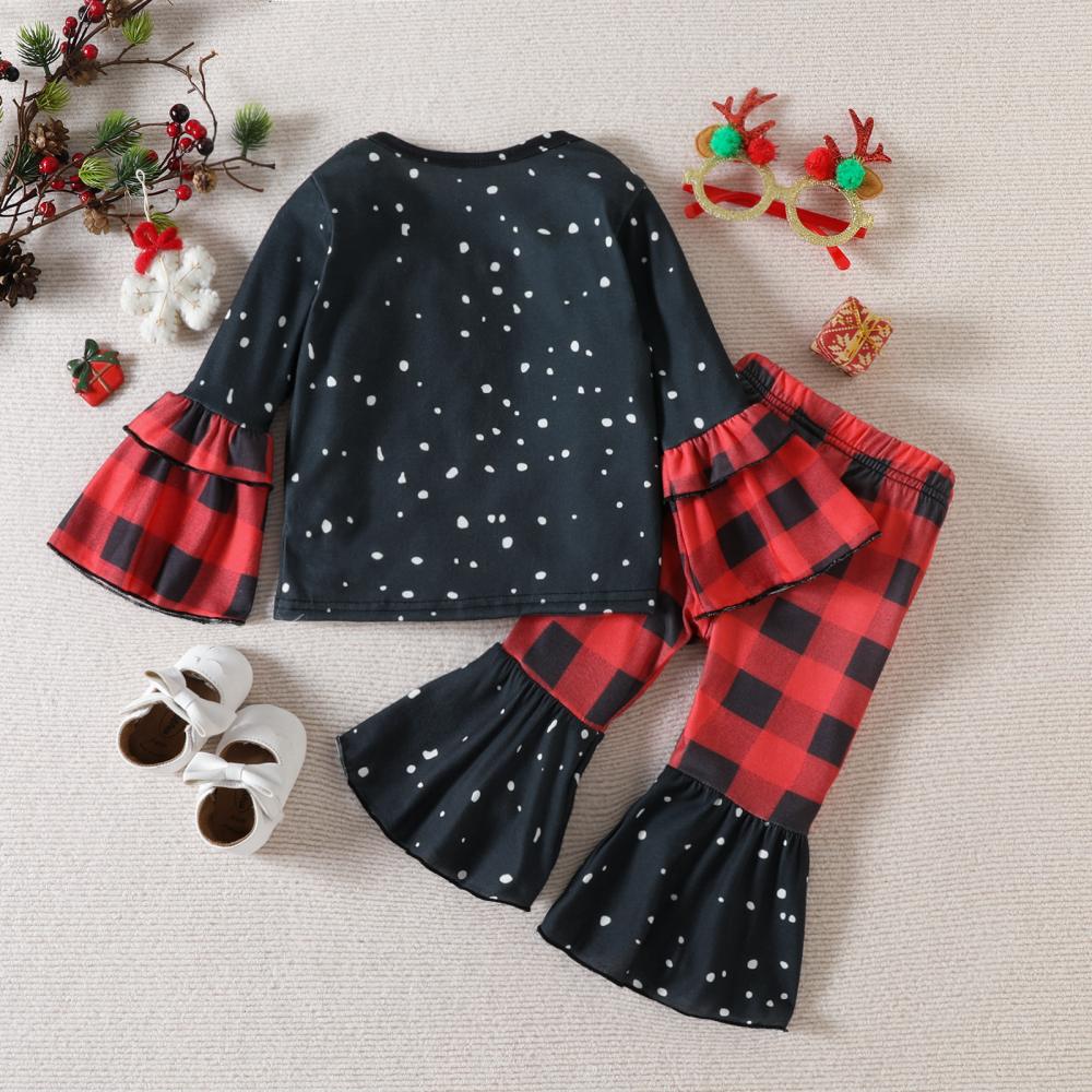 Autumn Girls Christmas Flared Sleeve Top + Plaid Trousers Set Wholesale Girls Clothes