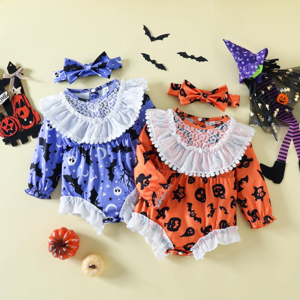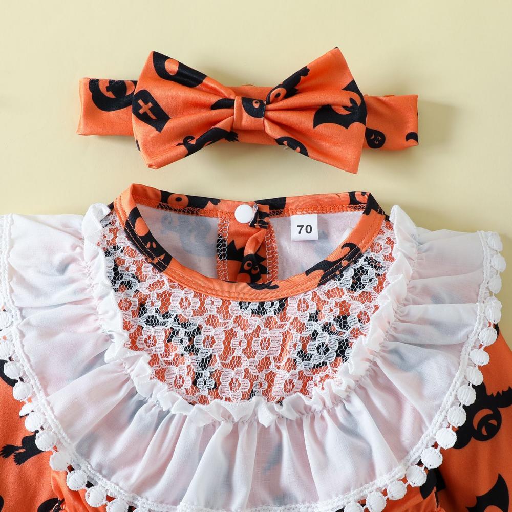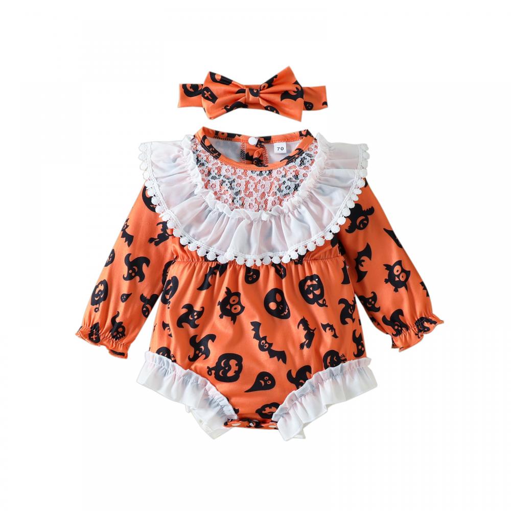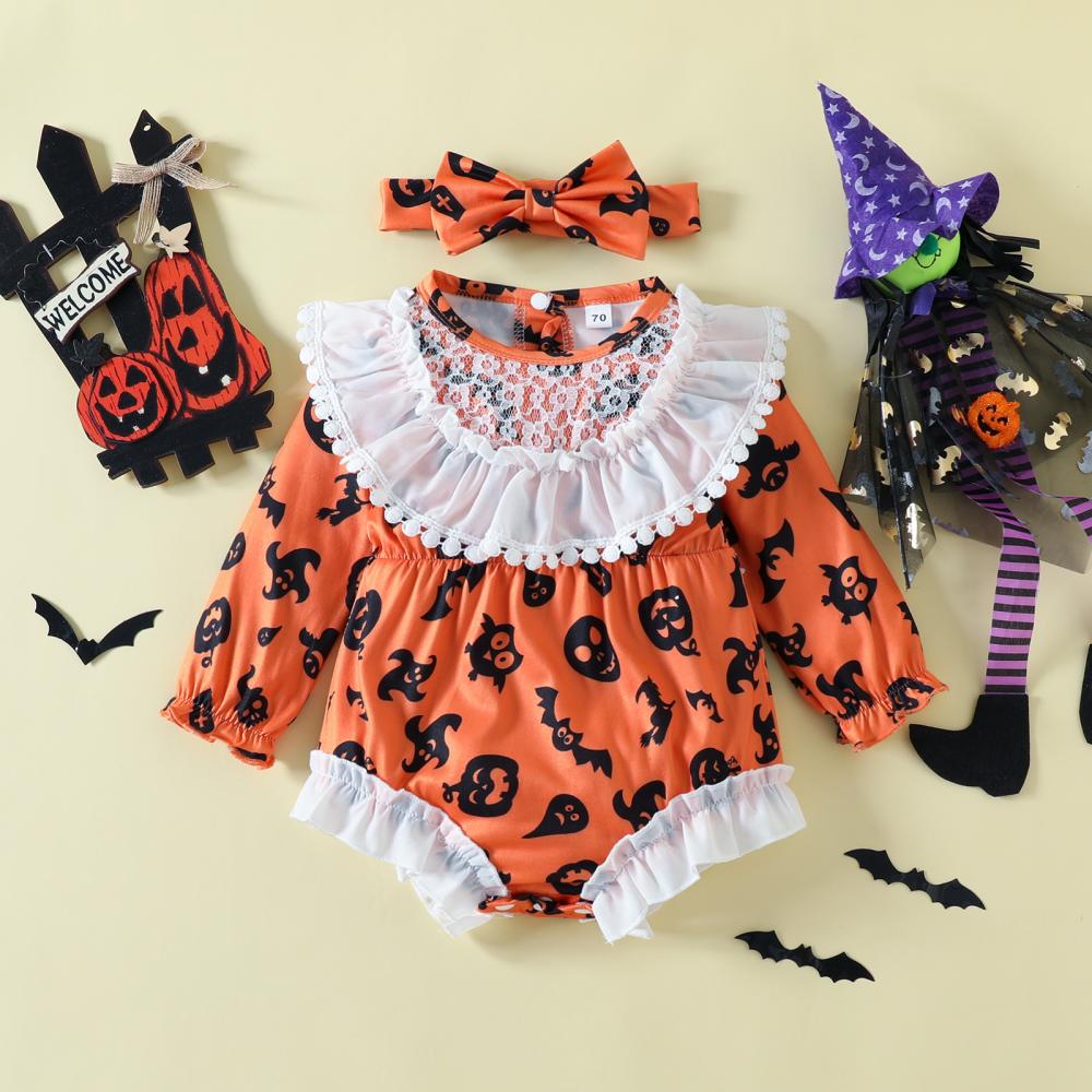 Halloween Baby Girl Autumn Cartoon Print Romper + Hairband Wholesale Girls Clothes