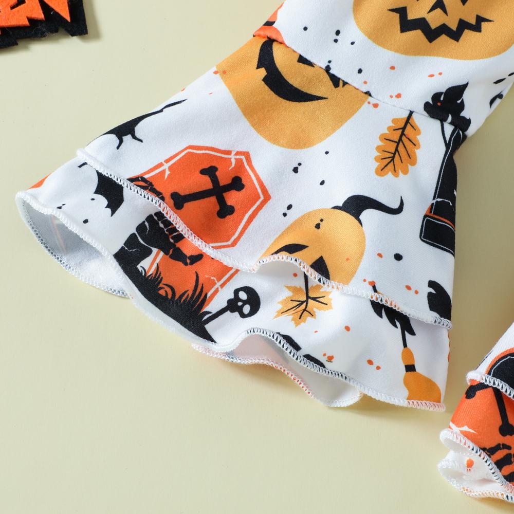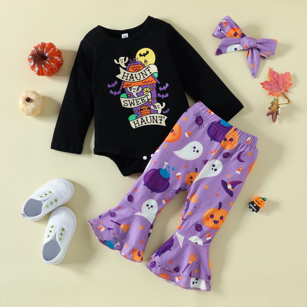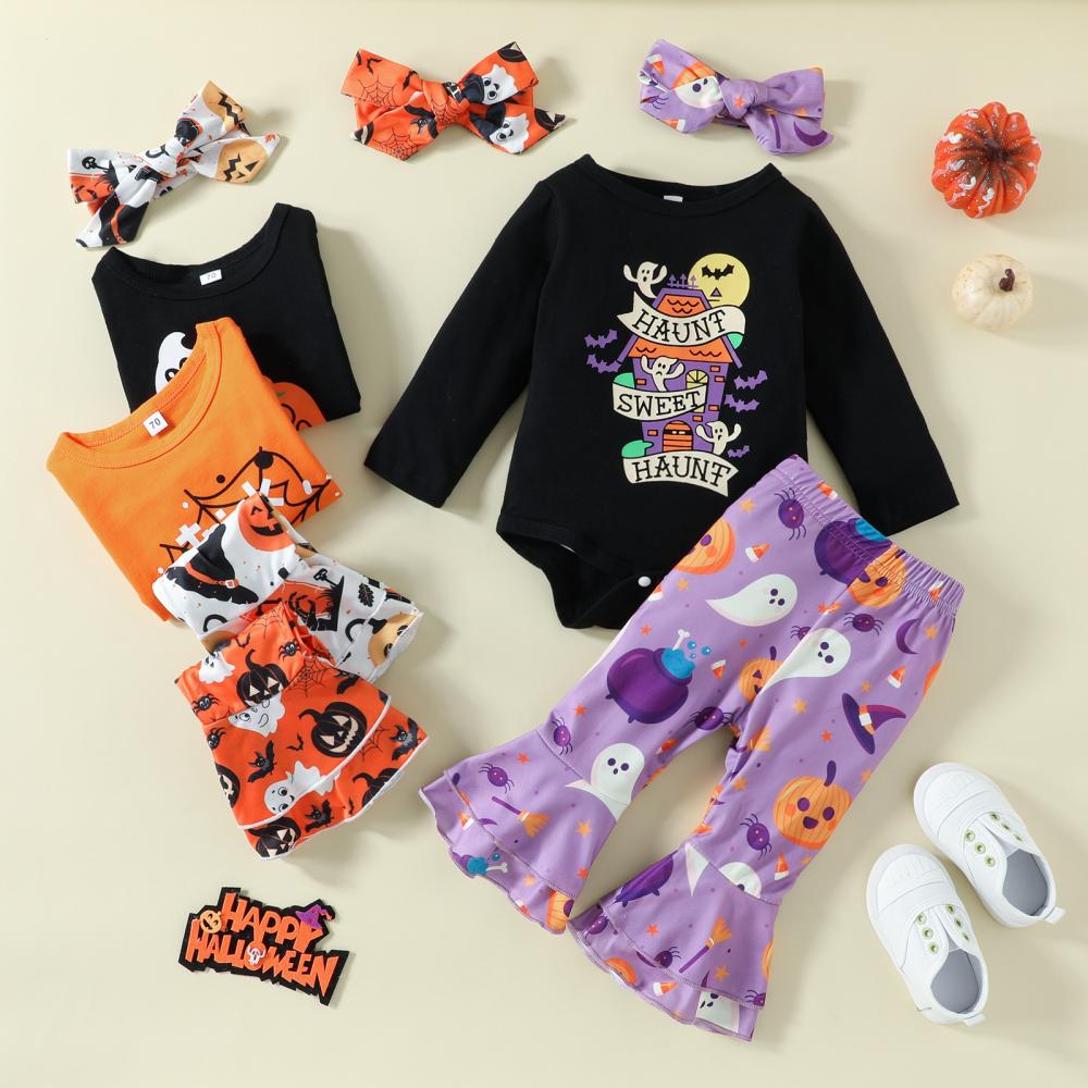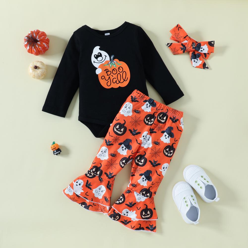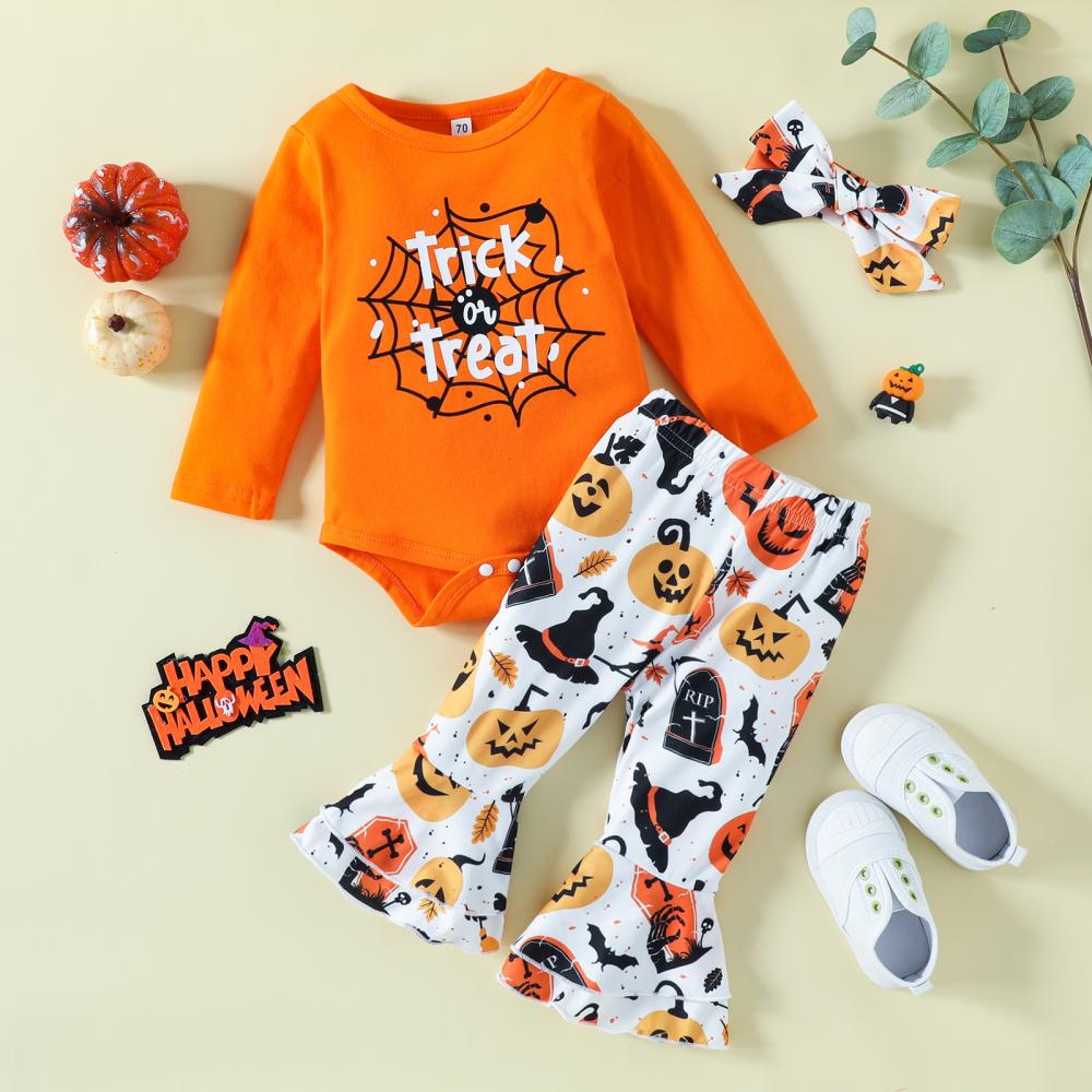 Halloween Infants and Toddlers Cartoon Print Romper Flared Pants Headband Three-piece Set Wholesale Baby Clothes