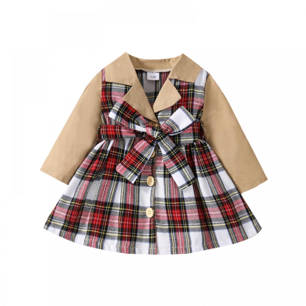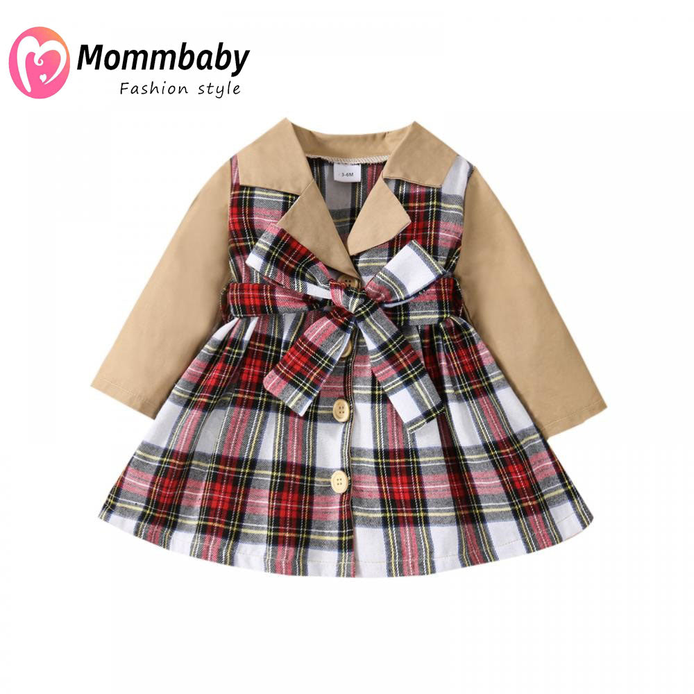 Mommbaby Christmas Autumn and Winter Plaid Stitching Trench Coat Girls Dress Kids Clothes