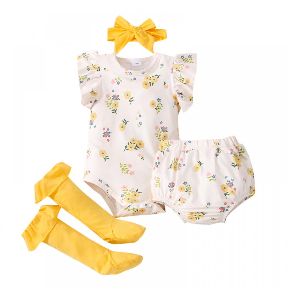 4PCS Baby Girls Floral Romper Shorts Headband Socks Where To Buy Baby Clothes In Bulk
