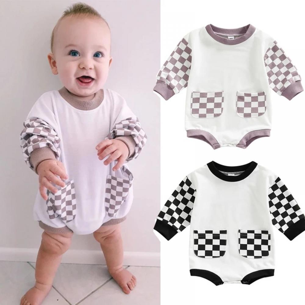 Autumn Plaid Pocket Colorblock Long Sleeve Jumpsuit Wholesale Baby Clothes