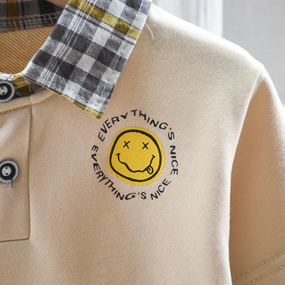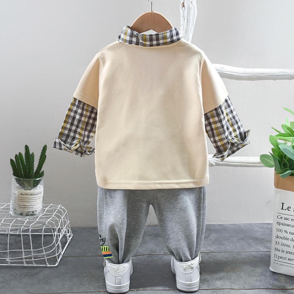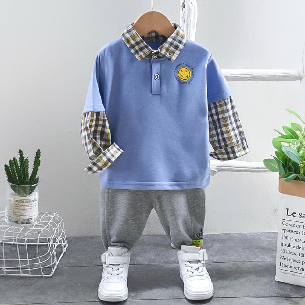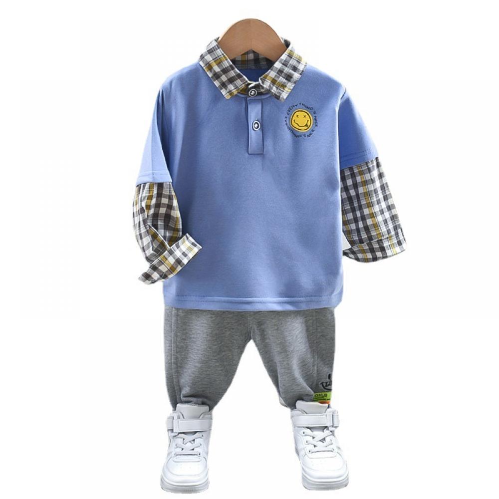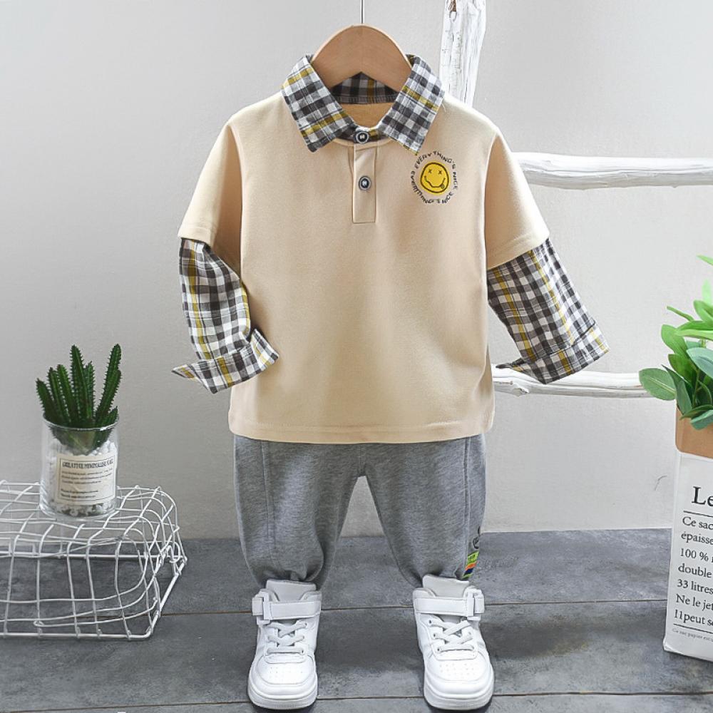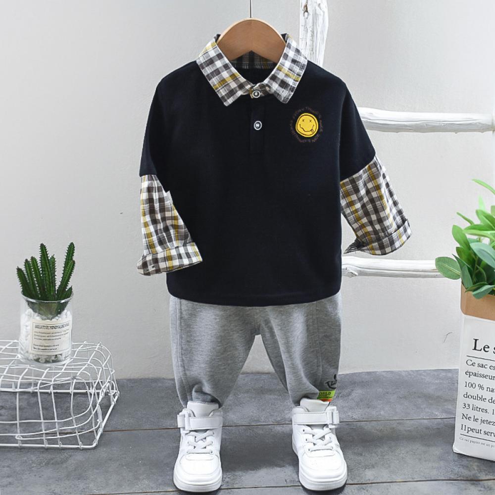 Boys Spring Autumn Plaid Patch Smile Top and Pants Set Girl Boutique Clothing Wholesale