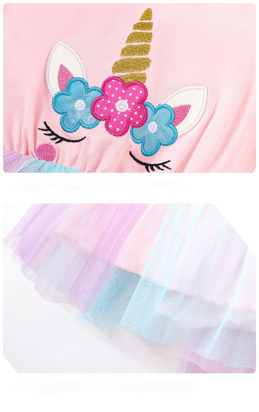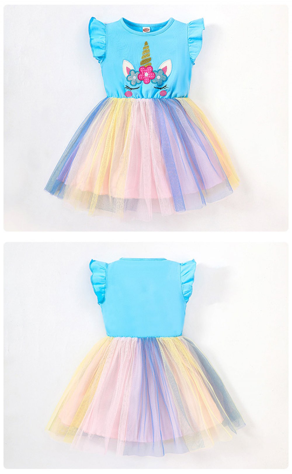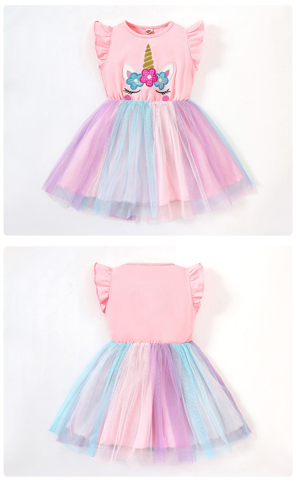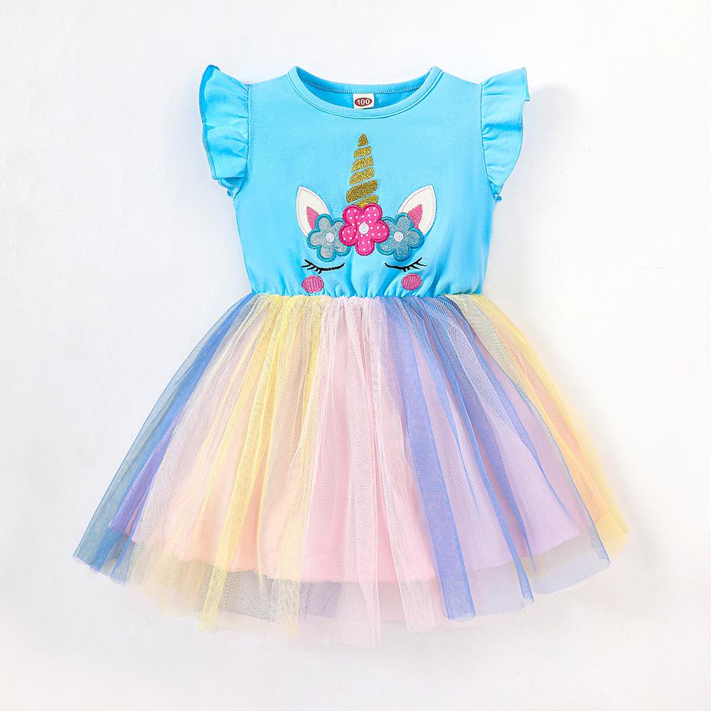 Summer Girls' Cartoon Unicorn Mesh Short Sleeve Princess Dress Wholesale Girls Dresses