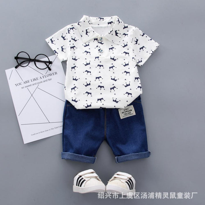 Toddler Boys Summer Set Crown Printed Lapel Top and Denim Shorts Wholesale childrens clothing in bulk