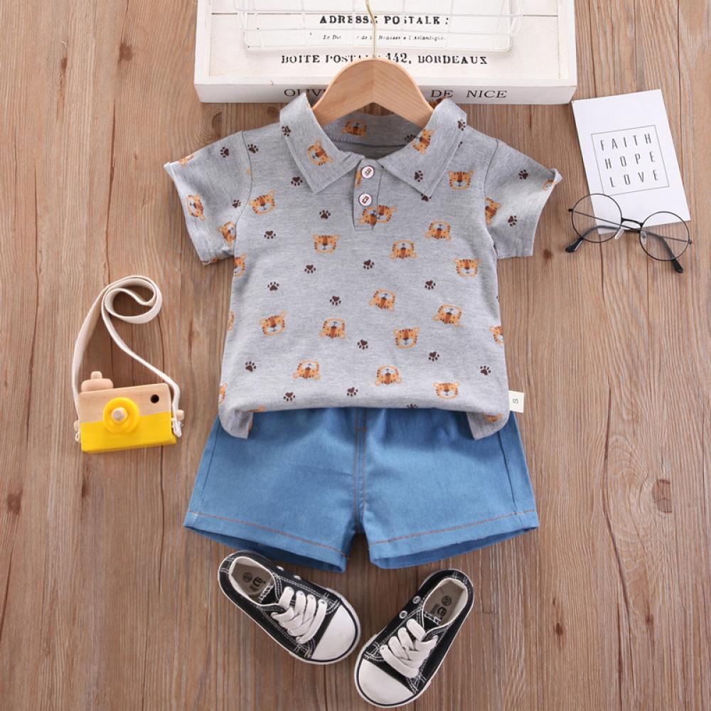 Toddler Boys Summer Set Lapel Lion Printed Top + Denim Short Baby Boy Overalls